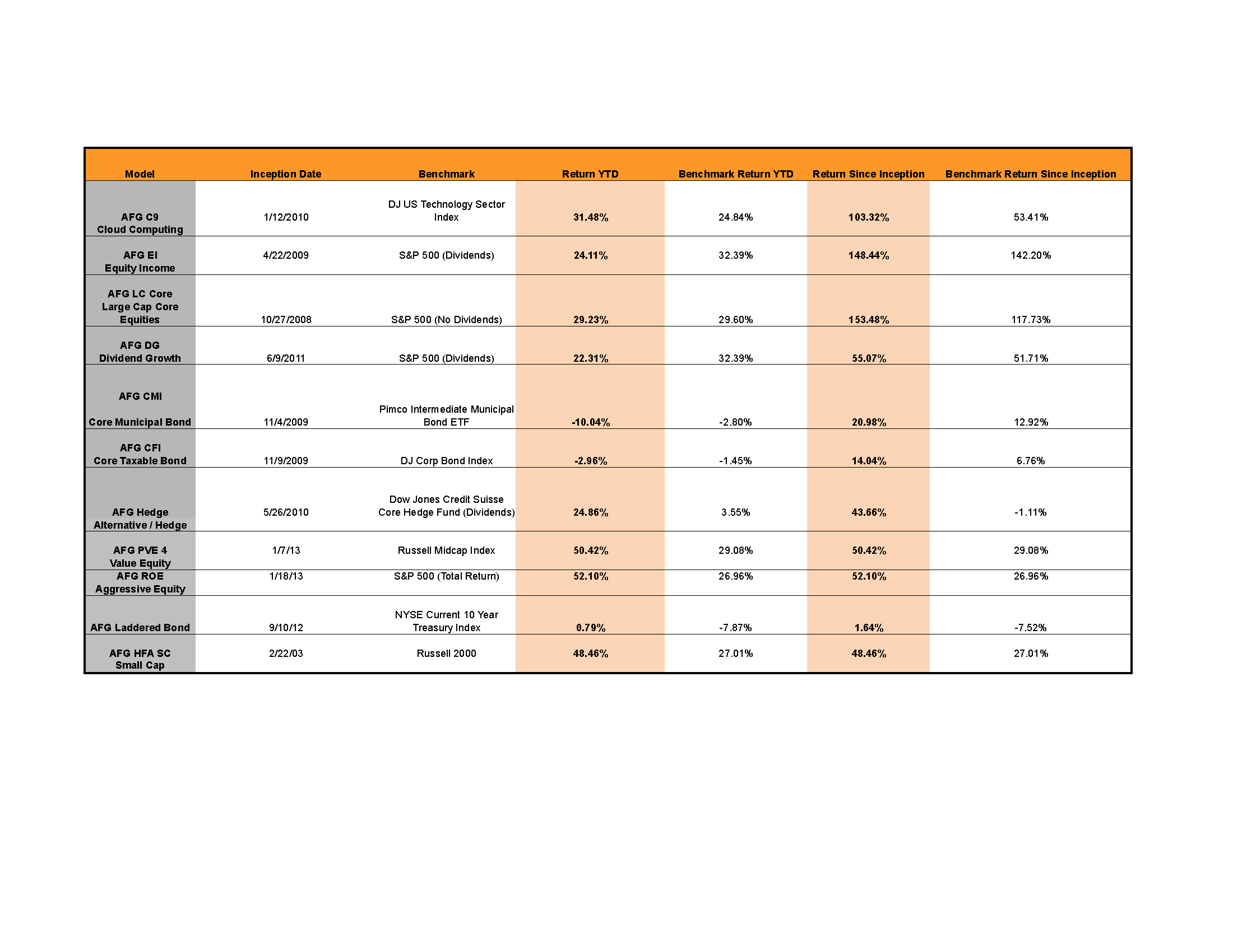 Here are the Year-to-date and Since Inception performance results of our most commonly used Models as of December 31, 2013